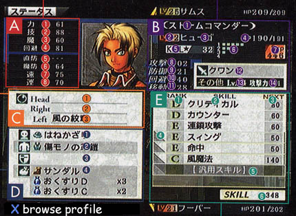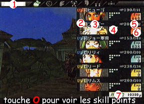 | SKILL c'est ce qui est le plus nouveau dans les suikoden. Un skill, c'est une capacité à faire quelquechose (frapper plus fort, plus vite,contre attaquer, être plus puissants dans certain sort...) il y a deux types de skill, les skills magiques, et les skills de combats. On les fait évoluer chez des Bujutsu teacher et des centres de formation, grace à des skill points obtenu dans les combats. | |