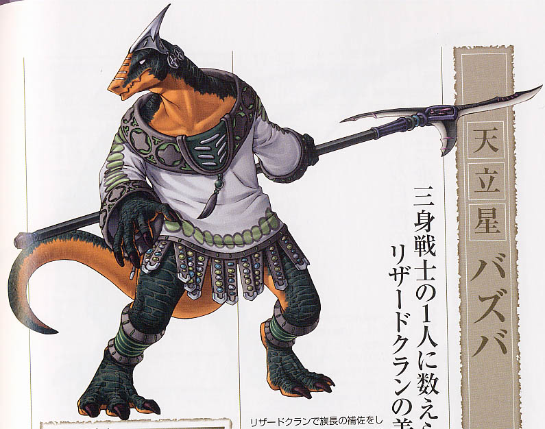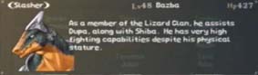 commentaire: As a member of the Lizard Clan, he assists Dupa, along with Shiba. He has very high fighting capabilities despite his physical stature.